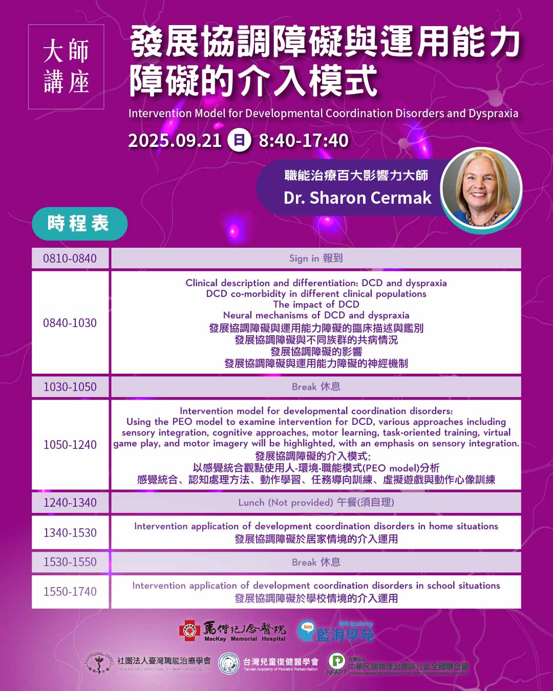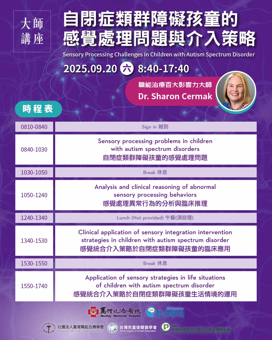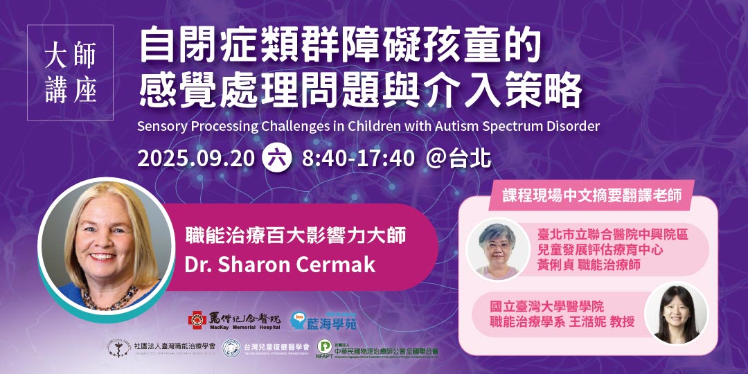 本次課程榮幸邀請到南加州大學職能科學與職能治療學系(Occupational Science and Occupational Therapy)榮譽教授 Dr. Sharon Cermak。她曾入選 The American Occupational Therapy Association 全球百大有影響力的職能治療師,專注兒童發展研究逾五十年。